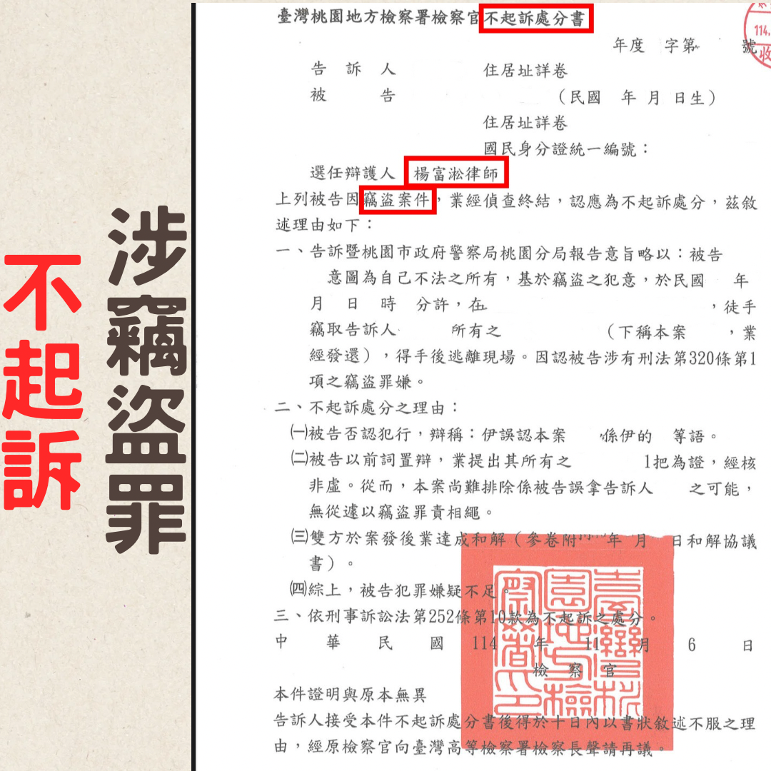 首頁 > 成功案例 > 拿錯他人物品被告竊盜怎麼辦? 不起訴|勝訴 | 桃園律師 | 桃園竊盜案件律師 | 桃園律師事務所
