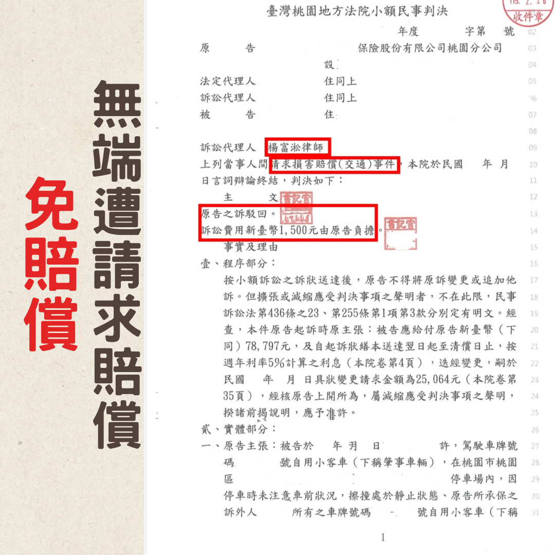 當事人完全不需支付任何修車之賠償,連訴訟費也由對方負擔,成功守住清白與荷包。